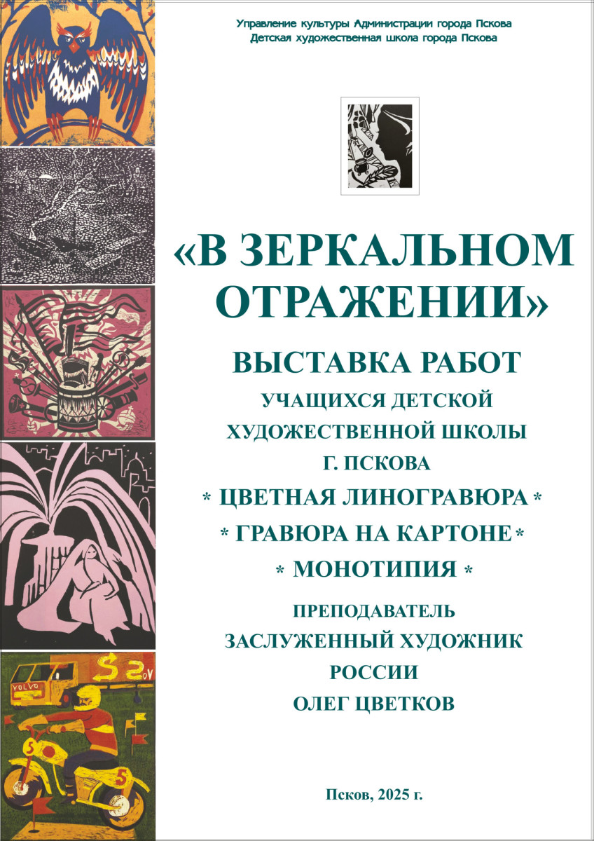 В зеркальном отраженииВ детской художественной школе имени И.Ф. Хруцкого г. Новополоцка (респ. Беларусь) состоялось открытие ретроспективной выставки печатной графики учащихся ДХШ г. Пскова. Договор о двустороннем сотрудничестве между нашими школами был подписан три года назад. За это время в выставочных залах Пскова и Новополоцка был показан ряд интересных и важных выставок, отражающих основные направления учебной работы этих школ. Важным обстоятельством является то, что оба учебных заведения давно уже стали ведущими в России и Белоруссии. Данная экспозиция является своеобразным итогом почти 50-летней работы факультатива по печатной графике талантливых псковских учеников. Работы юных художников разных поколений, выполнены под руководством известного преподавателя и художника Олега Цветкова. Разнообразны и интересны темы над которыми работали псковичи - иллюстрации к произведениям К.И. Чуковского «Муха Цокотуха», «Мойдодыр», «Федорино горе», «Доктор Айболит». Неожиданно и ярко воспринимаются темы, связанные с историческим прошлым России — Отечественная война 1812 года, работы посвящённые 80-летию Победы советского народа в Великой Отечественной войне, 250-летие создания Петром Первым российского флота и др. Не обошли вниманием юные художники и свой любимый город Псков, его историю и достопримечательности. В экспозиции прозвучала и столь любимая юными художниками тема «Цирка». На выставке показано более 70 графических произведений, которые получили достойную оценку и восхищение белорусской публики. В те же самые дни в выставочном зале Псковской художественной школы открылась вторая часть выставки печатной графики. На ней было представлено более 130 графических работ учеников нашей школы выполненных в техниках: монотипии, цветных и чёрно-белых линогравюр, а также гравюр на картоне. Обе выставки успешно работают. Мы имеем возможность увидеть сегодня замечательные произведения наших лучших выпускников прошлых лет: Данилы Афанасьева, Марии Серовой, Алины Абысовой, Константина Денисова, Андрея Тимофеева, Светланы Шатиловой, Алёны Малышевой, Михаила Голова и многих других. Все они, после окончания нашей школы и получения высшего художественного образования стали профессиональными художниками, каждый в своём, им выбранном направлении в изобразительном искусстве. А это и есть самый достойный итог обучения в нашей школе и его конечная цель. Хотим добавить, что все молодые, современные псковские художники-графики прошли наш замечательный факультатив. А стало быть, они получили хорошую прививку вкуса, работоспособности и целеустремленности в искусстве.